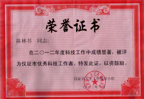 仪征日发干燥设备有限公司总工程师陈林书以科技发展观为引领,立足本职工作,在科学技术研究,新产品开发,科技成果推广和应用等工作中取得了突出成绩,为我公司及仪征市创新型经济发展作出了较大的贡献,特别是连续式流化床的四代技术上都作出巨大创新。为大力弘扬“奉献、创新、求实、协作”的科学精神,发扬成绩,激励先进,仪征市人才工作领导小组办公室授以“仪征市优秀科技工作者”荣誉称号。