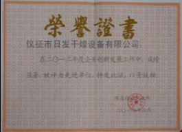 近日,陈集人民政府召开了一年一度的先进企业及优秀工作者表彰大会。仪征日发干燥设备有限公司在二〇一二年度企业创新发展中工作中成绩优秀,又一次被评为“先进单位“和”纳税明星企业“,政府领导对此表示了祝贺并颁发了数万元奖金以资鼓励。这也标志着日发干燥在本地区是具有活力的企业之一,更将进一步促进本公司不断增强自主创新能力。同时,我公司也向领导们作出郑重承诺,以后会将技术创新和市场拓展一起抓,争取在本年度将知识产权数量和市场营销额再翻一番。