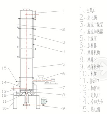 高速热气流带着湿颗粒,从干燥器的底部沿切线方向进入下层的一个干燥器。热气流和物料粉粒在室中高速回旋,离心力将固体颗粒和气体分开,颗粒随着角动量的减少,随着气流通过挡板的中心开口进入上一个室中,由于离心力的作用,颗粒再次作旋转运动,离心力和重力作用在不同大小的颗粒上,造成两者的速度出现差异,小粒子在干燥器中滞留时间短,大颗粒在干燥器中滞留时间长。这样不同粒径的颗粒都能得到良好的干燥效果。