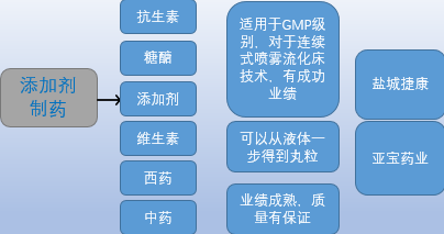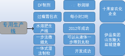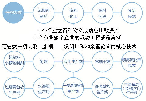 相关成套技术分别应用于生物发酵,添加剂、制药,农药、化工,肥料、环保,食品、果蔬,超粘料,饲料添加剂,包衣等十大行业,供给客户的生产线产出的产品大部份以上均为新产品,实现了持续创新、新产品成为了公司日常核心产品,从信用、经历、业绩、特别是成功的创新模式上解决了客户的新产品生产线有很大风险的疑问。提出第三代、第四代、第五代、第六代技术的理念和四次技术革命,比如在一步法微细丸生产线、氨基酸蛋白、甜味剂、酶制剂、生物水溶肥等领域,与多家国内企业达成长期战略合作,成为相关产品的供应商。